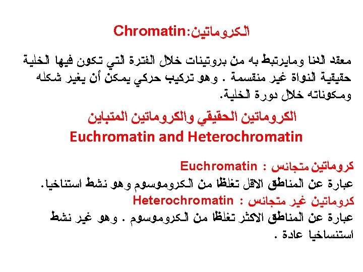 • Heterochromatin: dark-staining, condensed (mostly simple-sequence DNA) • Euchromatin: lightstaining, less condensed (complex sequence DNA: e. g. genes)