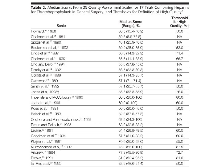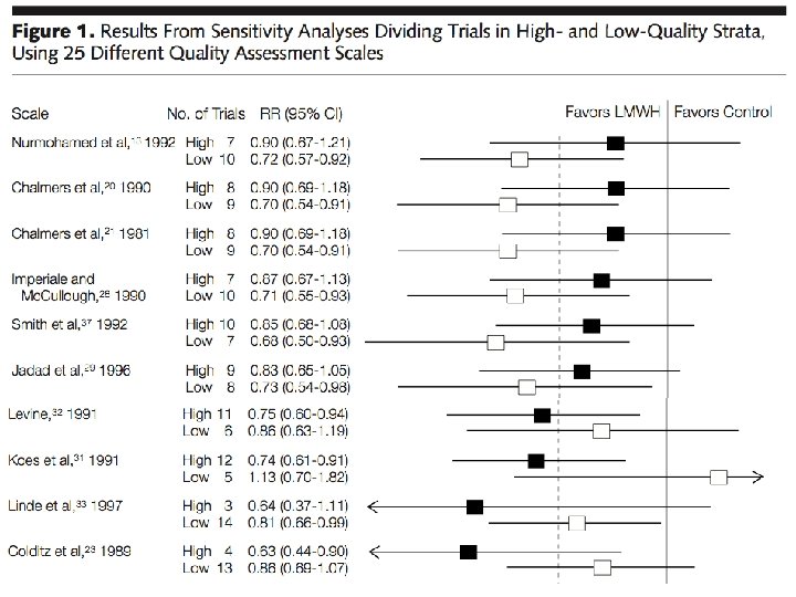 JAMA paper Different quality scores (n=25) applied to one meta-analysis Based on quality score studies were divided into high and low quality Summary estimate by quality Standard assumption: better quality results in more valid estimates