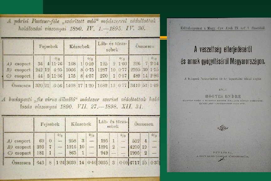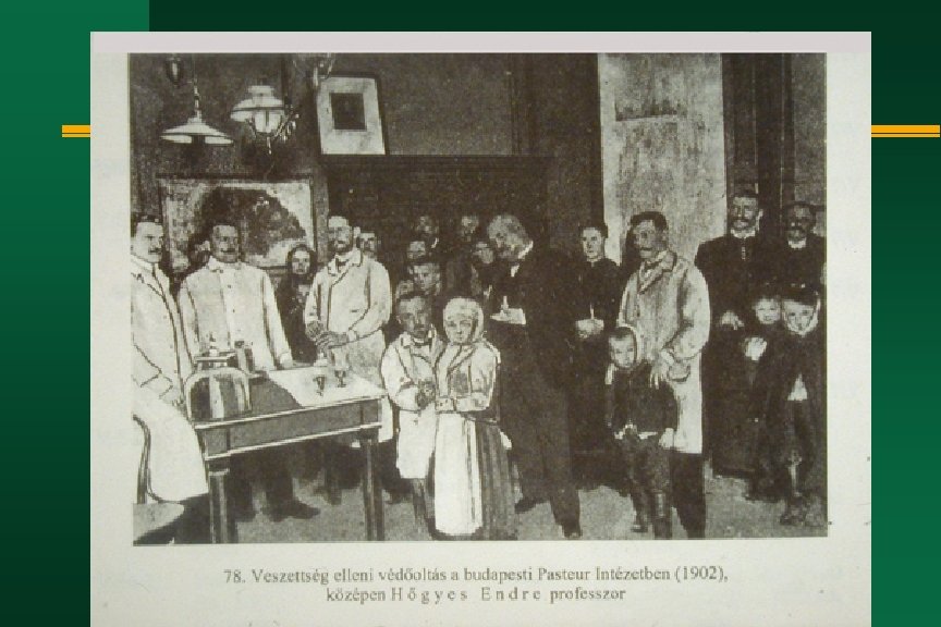 Hőgyes Endre életének kronológiája 1890 jan. 18 VKM leirat megbízza a Pasteur-intézet vezetésével - ápr. 15 megkezdte a rendszeres oltásokat a veszettség ellen a felállított Pasteurintézetben n 1893 a Magyar Orvosi Könyvkiadó Társulat elnöke n 1894 -96 dékán n 1896 szerkesztette az orvoskar millenáris emlékkönyvét n