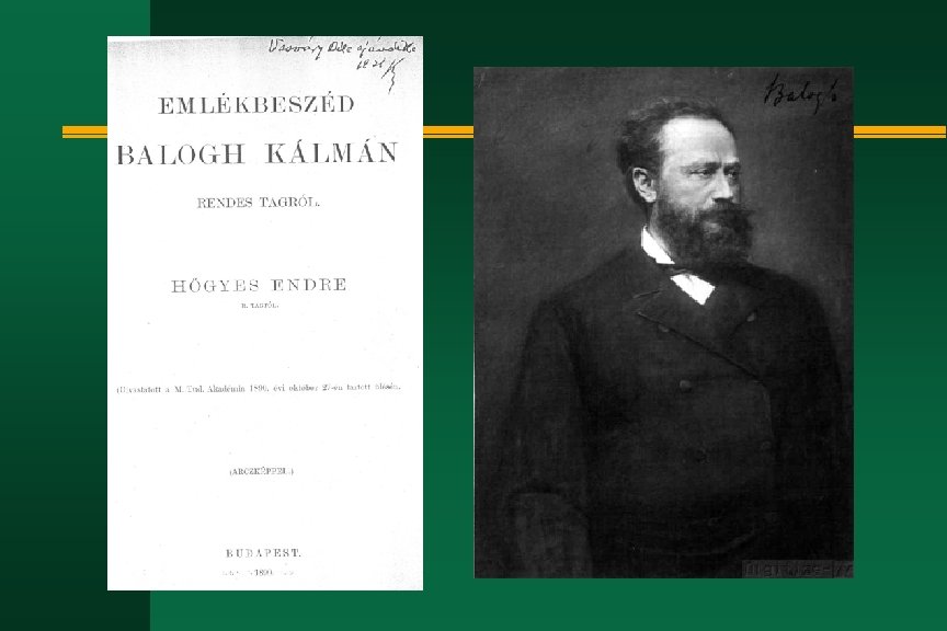 Hőgyes Endre életének kronológiája n n n 1874 febr. 5 magántanári megerősítés Kísérletes kórtan tárgykörből 1875 márc. 8 tanári kinevezés Kolozsvárott az Általános Kór- és Gyógyszertani Tanszékre 1880 ápr. 15 Balogh Kálmán az MTA ülésén bemutatja a labyrinthus működését leíró munkáját. 1882 jún. 1 az Akadémia levelező tagja 1883 jan. 17 kinevezik a budapesti m. k. tudományegyetem orvosi karának újonnan létrehozott általános kórtani tanszékére ny. r. Tanárként 1884 nov. 17 székfoglaló előadás az Akadémián