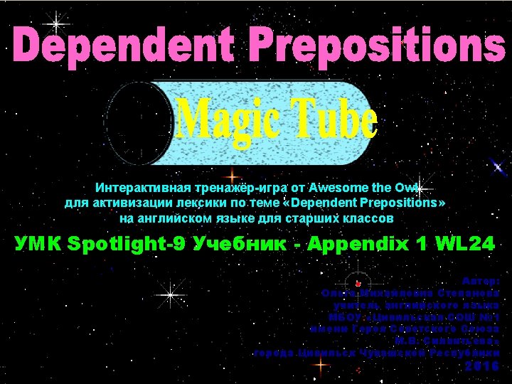 Hi! Let’s play MAGIC TUBE game! Haw can you remember or you have already remembered the new words from the topic Dependent Prepositions? Let’s Start! http: //mykids. ucoz. ru/