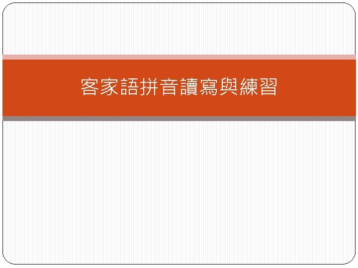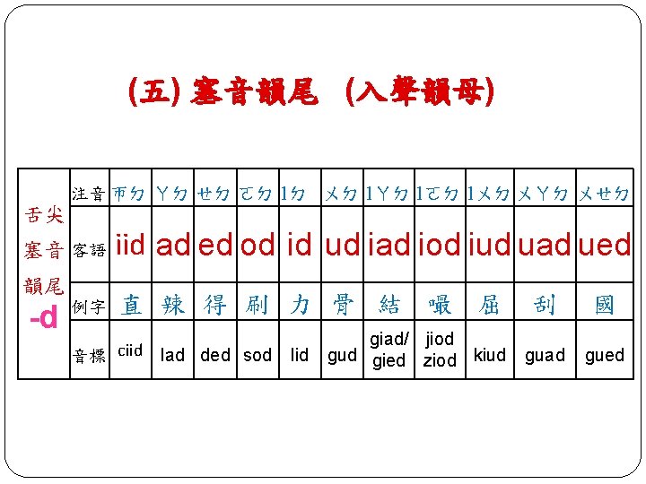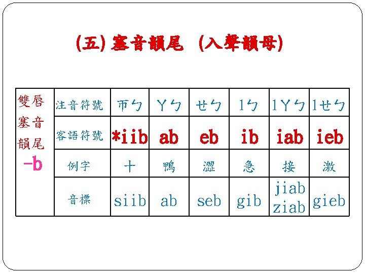 寫出聲母和入聲韻母 漢字 拼音 ziibˋ bodˋ ngiab 發閼 adˋ 職業 zhid bod ad ngiabˋ mugˋ ziibˋ 目汁 mug zhib giedˋ kiug 結局 gied kiugˋ zedˋ 側角 gogˋ tiedˋ 鐵尺 cagˋ tied cag 漢字 (可不加聲調) 拼音 gagˋ 隔壁 biagˋ gag biag 獨立 tug lib tugˋ libˋ 漢字 壓力 拼音 abˋ lid ab lidˋ zugˋ 竹殼 hogˋ zhug hog fabˋ guedˋ lud sud 法律 國術 fad lud gued labˋ ngiug sudˋ lab 臘肉 ngiugˋ gidˋ 吉日 ngidˋ xib hab 集合 sibˋ giogˋ 腳骨 gudˋ