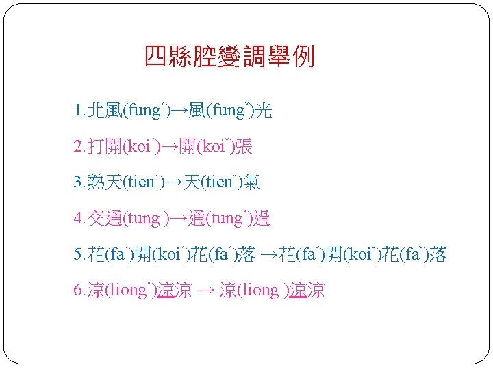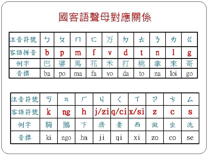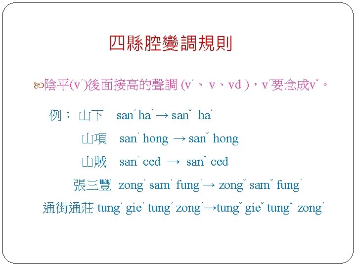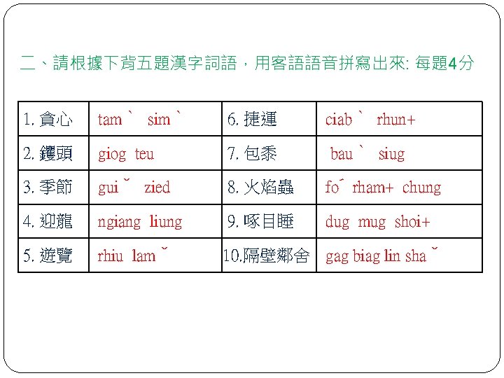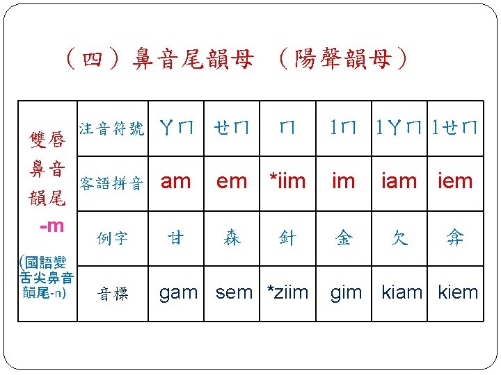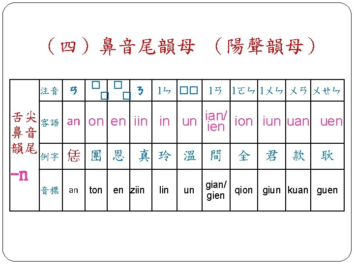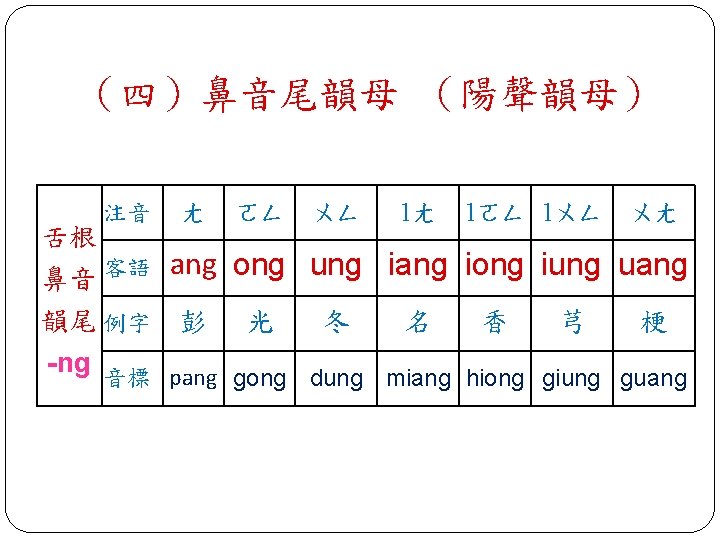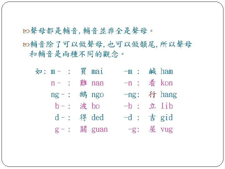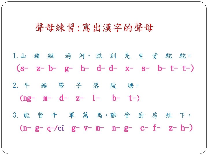 寫出聲母和陽聲韻母 漢字 希望 間房 光線 拼音 hi´ mong hiˋ mong+ gien´ fong˅ gienˋ fong gong´ xien gongˋ sien˅ xiang fam siang˅ fam+ 漢字 拼音 問題 mun ti˅ mun˅ ti 貪心 tam´ xim´ tamˋ simˋ 精神 jin´ siin˅ zinˋ shin (可不加聲調) 漢字 拼音 liung˅ fung 龍鳳 liung fung+ 森林 sem´ lim˅ semˋ lim ngang ngion´ 硬軟 ngang+ ngionˋ ngiam´ kieu´ gim´ qien˅ 姓范 拈鬮 ngiamˋ 金錢 gimˋ cien kieuˋ giung´ zeu´ daˋ bong´ kiung˅ kuˋ 打幫 弓蕉 giungˋ 窮苦 da´ bongˋ kiung ku´ ziauˋ