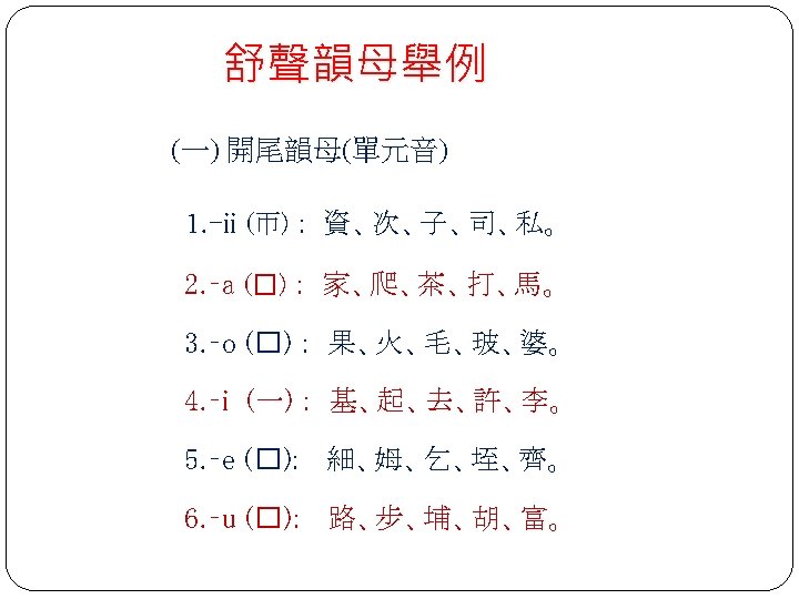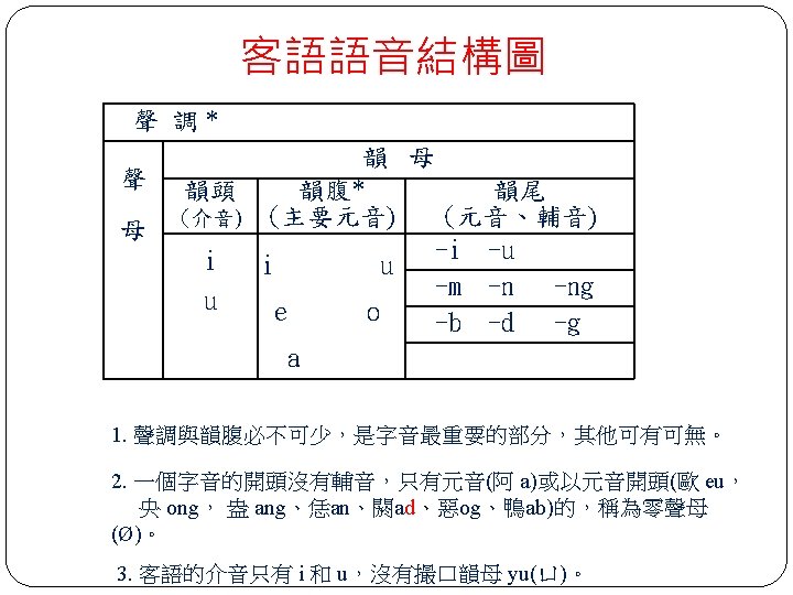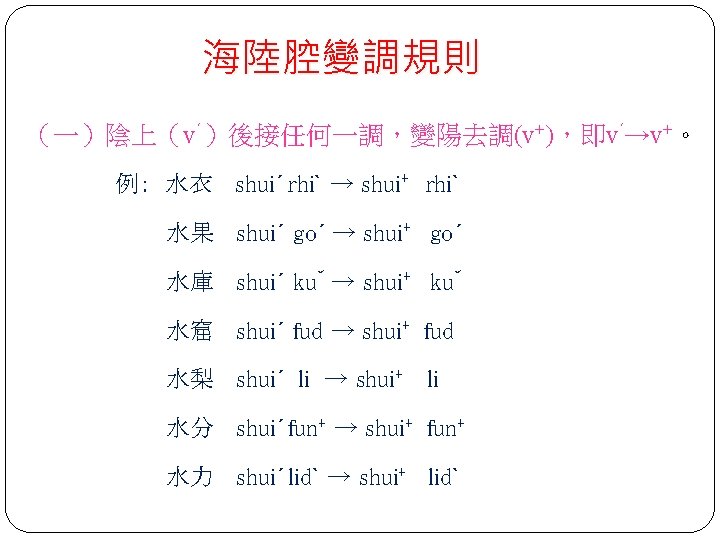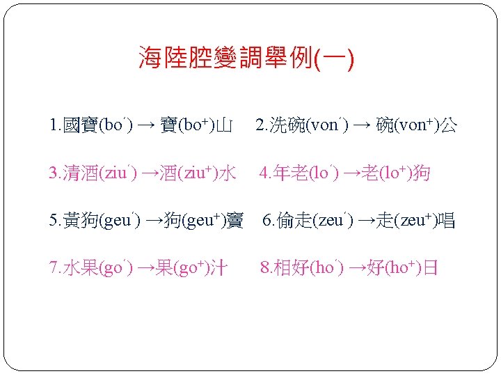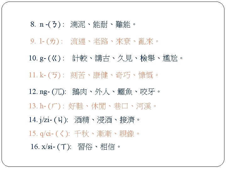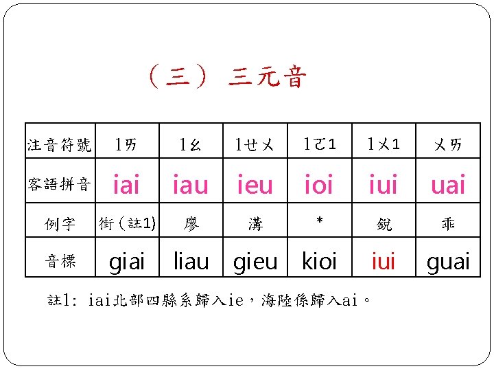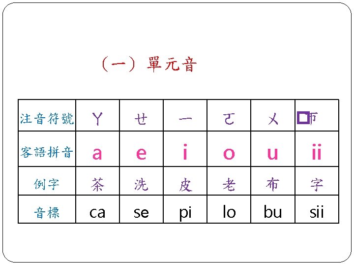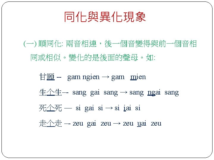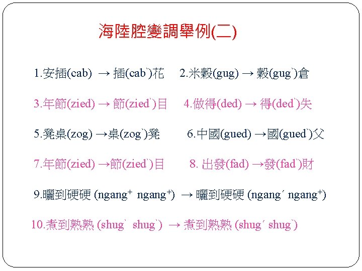 寫出聲母和陽聲韻母 漢字 希望 間房 光線 拼音 hi´ mong hiˋ mong+ gien´ fong˅ gienˋ fong gong´ xien gongˋ sien˅ xiang fam siang˅ fam+ 漢字 拼音 問題 mun ti˅ mun˅ ti 貪心 tam´ xim´ tamˋ simˋ 精神 jin´ siin˅ zinˋ shin (可不加聲調) 漢字 拼音 liung˅ fung 龍鳳 liung fung+ 森林 sem´ lim˅ semˋ lim ngang ngion´ 硬軟 ngang+ ngionˋ ngiam´ kieu´ gim´ qien˅ 姓范 拈鬮 ngiamˋ 金錢 gimˋ cien kieuˋ giung´ zeu´ daˋ bong´ kiung˅ kuˋ 打幫 弓蕉 giungˋ 窮苦 da´ bongˋ kiung ku´ ziauˋ