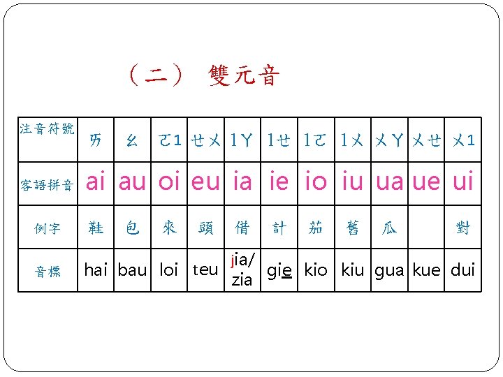 ai au g gai k kai eu ua ui ia io iu oi iau gua gui gia gio giu goi giau kua kui hia hio hiu hoi hiau ng ngai ngau h hai hau heu gieu kia kio kiu koi kiau guai ngia kuai ngia ngio ngiu ngoi u