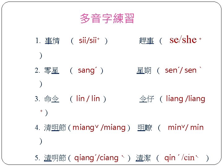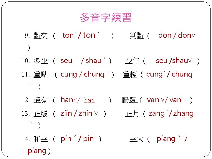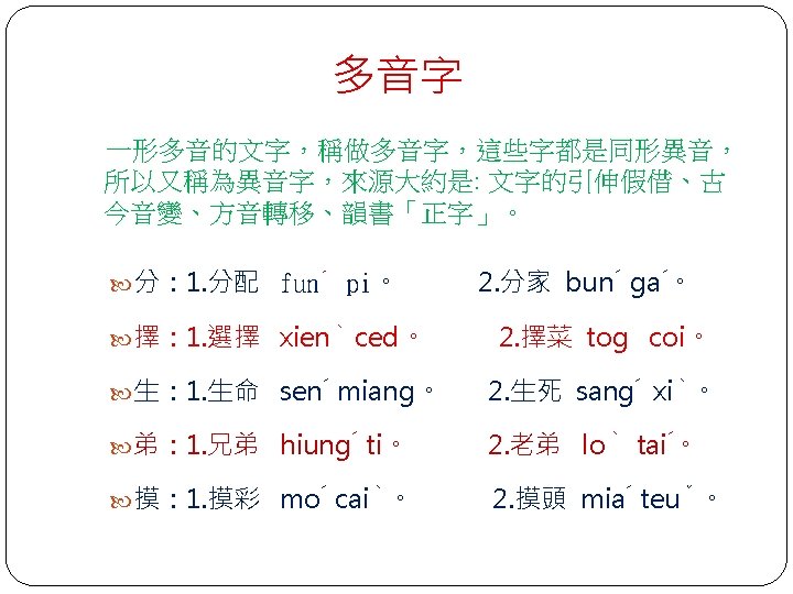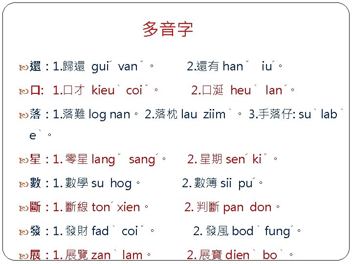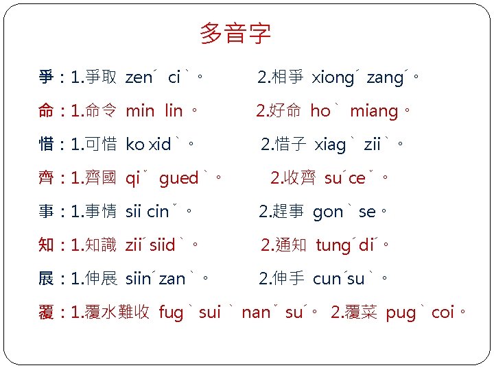 多音字 放: 1. 放心 fong sim´/ fong˅ simˋ 。 2. 放下 biong ha´ / biong˅ haˋ 。 平: 1. 平和 pinˇ foˇ / pin fo。 2. 平底 piangˇ daiˋ / piang dai´ 。 符: 1. 符合 fu ˇ hab /fu hab 。 2. 畫符 fa puˇ / fa+ pu 。 塑: 1, 塑膠 sog ˋ gau´ / sog gauˋ 。2. 塑像 zogˋ xiong / zog siongˇ 。 在: 1. 自在 cii cai / cii+ cai + 。 2. 無在 moˇ coi´ / mo coi ˋ 。 猛: 1. 猛虎 men´ fuˋ /menˋ fu ´ 。2. 猛火 mang´ foˋ / mangˋ fo´ 。 格: 1. 資格 zii´ giedˋ / ziiˋ gied 。 2. 方格 fong´ gagˋ / fongˋ gag 。