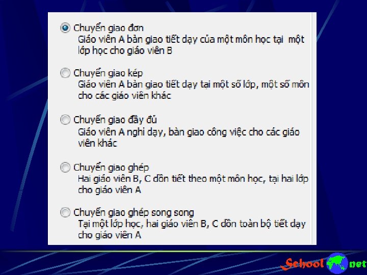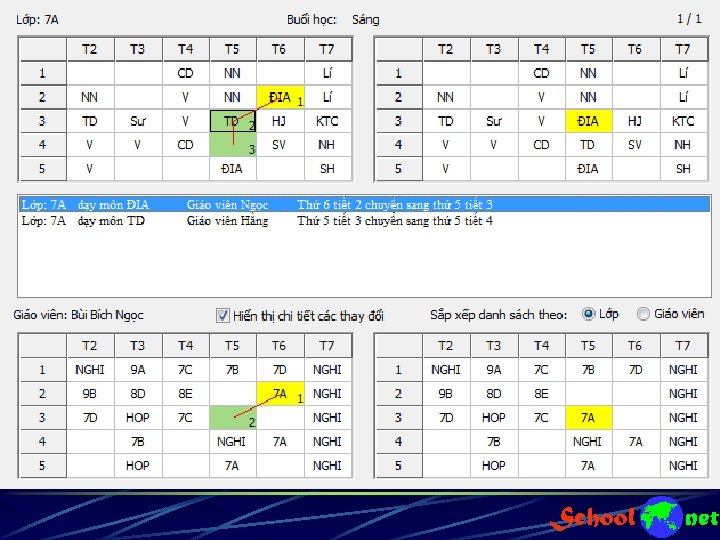 “dây giáo viên” trong lệnh tinh chỉnh dữ liệu TKB Trong phần mềm TKB, toàn bộ các lệnh tinh chỉnh dữ liệu thời khóa biểu cho phép người xếp quan sát các “dây” giáo viên bị ảnh hưởng khi tinh chỉnh. Như vậy người dùng sẽ kiểm soát được toàn bộ quá trình thay đổi dữ liệu khi tinh chỉnh thời khóa biểu.