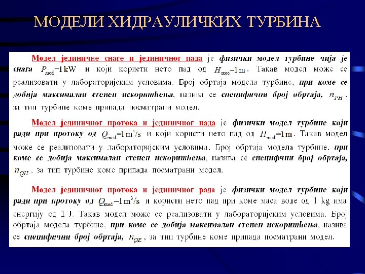 SPECIFI^NI BROJ OBRTAJA TURBINE Hidrauli~ke turbine se ispituju pomo}u fizi~kih modela male snage i malog pada Broj obrtaja modela turbine, pri kome se dobija maksimalan stepen iskori{}ewa, naziva se specifi~ni broj obrtaja za neki tip turbine. za model turbine snage Pmod=1 k. W pri padu od Hmod=1 m. • Модел јединичне снаге и јединичног пада • Модел јединичног протока и јединичне снаге
