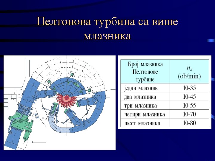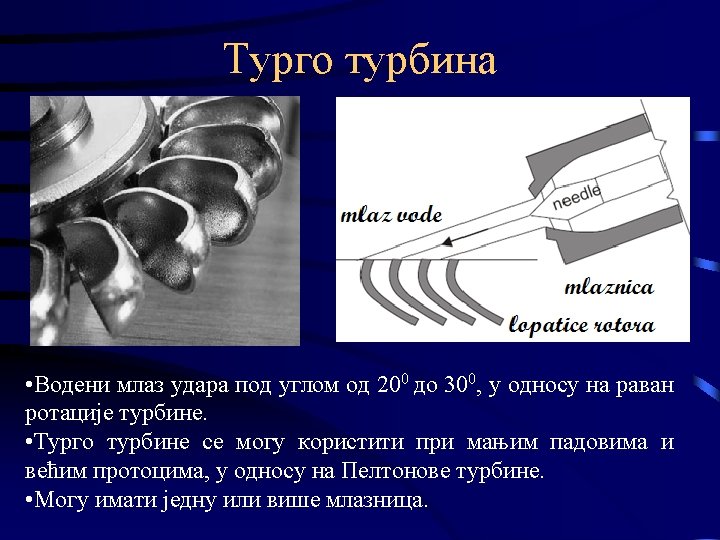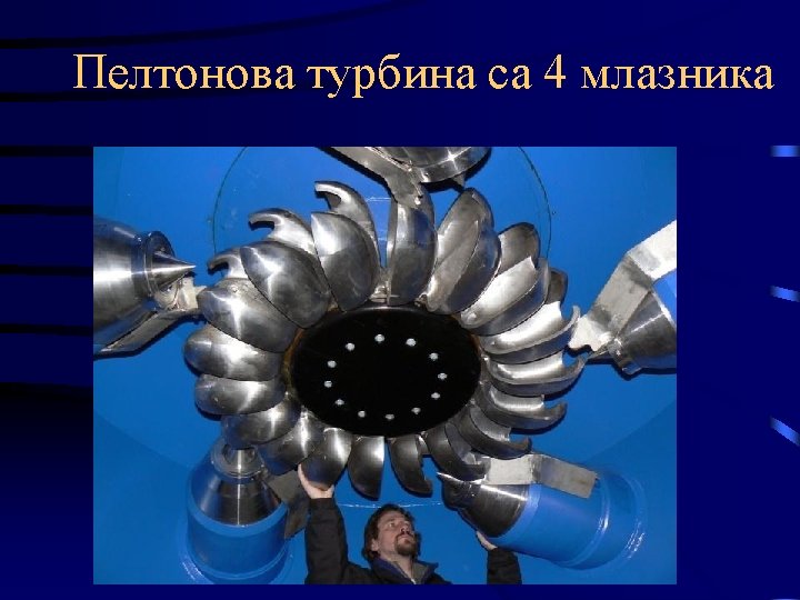 Princip rada Peltonove turbine Voda iz akumulacije se dovodi cevovodom do mlaznice