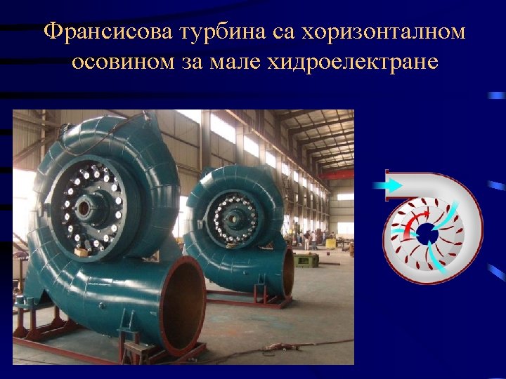 Fransisova turbina 1 -cevovod; 2 -spiralna komora; 3 -statorske lopatice; 4 -lopatice sprovodnog aparata; 5 -obrtno kolo; 6 -sifon; 7 -vratilo; 8 -sinhroni generator; 9 -stator sinhronog generatora; 10 -rotor sinhronog generatora; 11 -radijalni turbinski le`aj; 12 generatorski radijalni le`aj; 13 -generatorski radijalni le`aj; 14 -aksijalni le`aj; 15 spojnica.