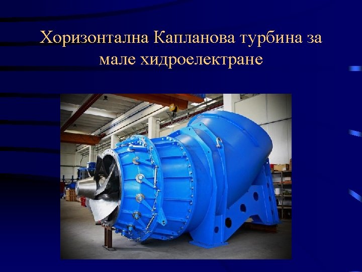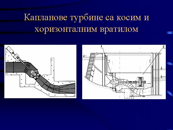Kaplanova turbina 1 - statorske lopatice; 2 - lopatice sprovodnog aparata; 3 - betonska spiralna komora; 4 - obrtno kolo; 5 - sifon; 6 - generator. Glavni vodeni tok kroz Kaplanovu turbinu je aksijalan. Obrtno kolo Kaplanove turbine ima 5 ili 6 lopatica koje se pomo}u mehanizma glav~ine mogu zakretati. Tako je i kod ovih turbina regulacija dvojna, preko sprovodnog aparata i zakretawem lopatica obrtnog kola.