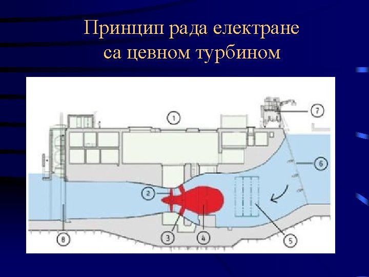 Cevne turbine 1 - obrtno kolo; 2 - sprovodni aparat; 3 - mehanizam za regulaciju sprovodnog aparata; 4 - statorske lopatice. 5 - otvor za remont; 6 i 7 - radijalni le`aj; 8 - aksijalni le`aj; 9 i 10 - rotor i stator; 11 - poklopac za remont; 12 - stepenice; 13 - prolaz za osobqe; 14 - elektri~ni razvod; 15 i 17 - kapsula generatora; 16 - dowi stub koji dr`i kapsulu; 18 - gorwi stub kroz koji se ulazi u kapsulu. Ove turbine imaju najve}u sposobnost propu{tawa vode, tako da i pri vrlo malim padovima mogu razviti velike snage. Cevne turbine reguli{u se dvojno, preko sprovodnog aparata i zakretawem lopatica obrtnog kola.