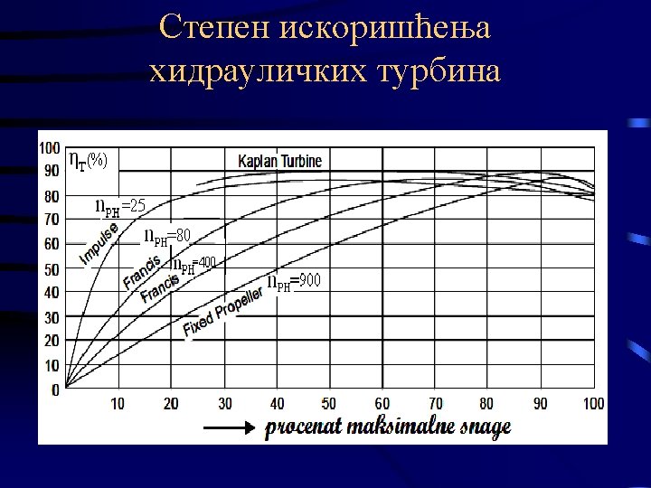 Hidrauli~ka snaga turbine је: H [m] - neto pad Q [m 3/s] - protok vode kroz turbinu Korisna snaga turbine (na vratilu) ne{to je mawa od hidrauli~ke snage zbog gubitaka u samoj turbini. Сtepen iskori{}ewa turbine: