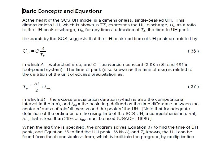 – Debit Puncak adalah volume air puncak yang mengalir melalui penampang melintang sungai atau saluran dalam satuan waktu tertentu, dinyatakan dalam satuan l/det atau m 3/det. – Waktu Konsentrasi atau Waktu Puncak adalah waktu yang diperlukan air untuk mengalir dari suatu titik terjauh pada suatu DAS hingga titik yang ditinjau. – Waktu Tenggang (time lag) adalah jarak waktu antara titik berat hujan efektif dengan titik berat hidrograf. – Waktu dasar (time base) adalah waktu mulai dari aliran nol sampai berakhir nol lagi. Shape : 1. Segitiga 2. Lengkung