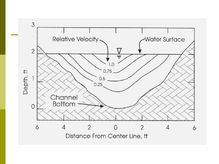 Distribusi kecepatan pada penampang saluran p Dengan adanya suatu permukaan bebas dan gesekan disepanjang dinding saluran, maka kecepatan dalam saluran tidak terbagi merata. Kecepatan maksimum terjadi pada 0. 05 s/d 0. 25 dari permukaan. p Makin ke tepi makin dalam p