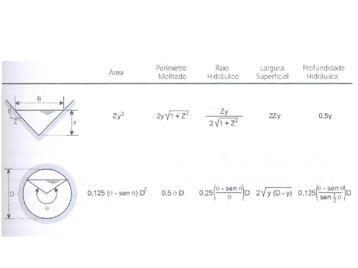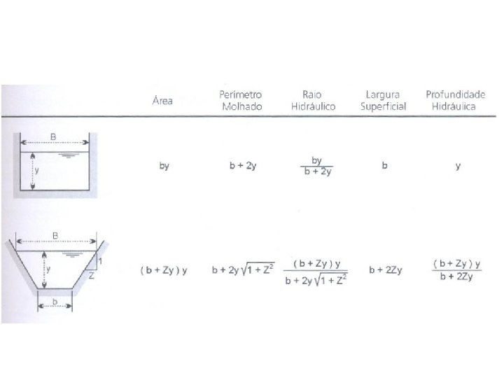 B largura superficial A área molhada P perímetro molhado Y profundidade (fundo à superfície) Yh = A/B Profundidade hidráulica R raio hidráulico