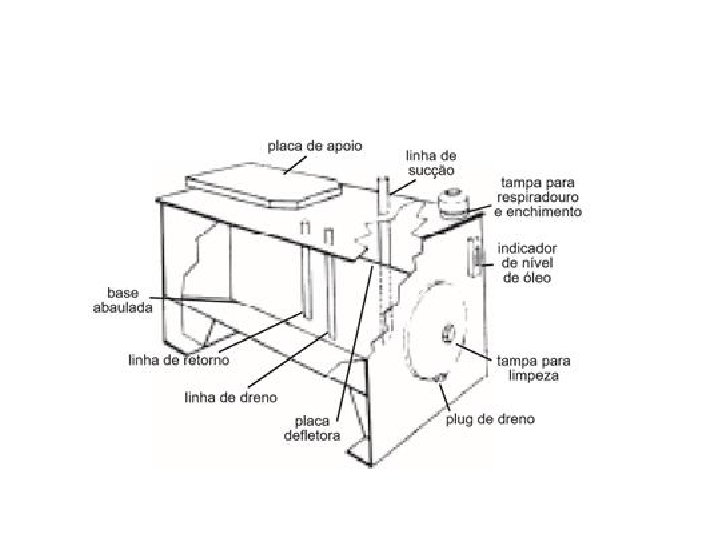 • Reservatório: Os reservatórios hidráulicos consistem de quatro paredes (geralmente de aço); uma base abaulada; um topo plano com uma placa de apoio, quatro pés; linhas de sucção, retorno e drenos; plugue do dreno; indicador de nível de óleo; tampa para respiradouro e enchimento; tampa para limpeza e placa defletora (Chicana). •