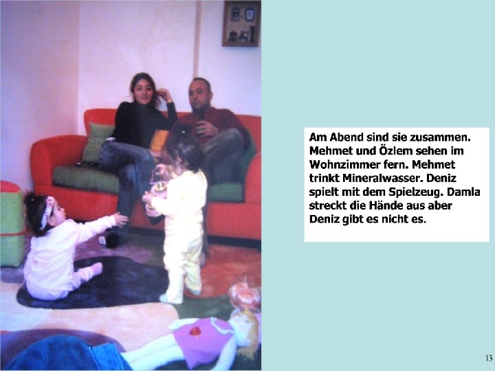 Am Abend sie zusammen. Mehmet und Özlem sehen im Wohnzimmer fern. Mehmet trinkt Mineralwasser. Deniz spielt mit dem Spielzeug. Damla streckt die Hände aus aber Deniz gibt es nicht es.