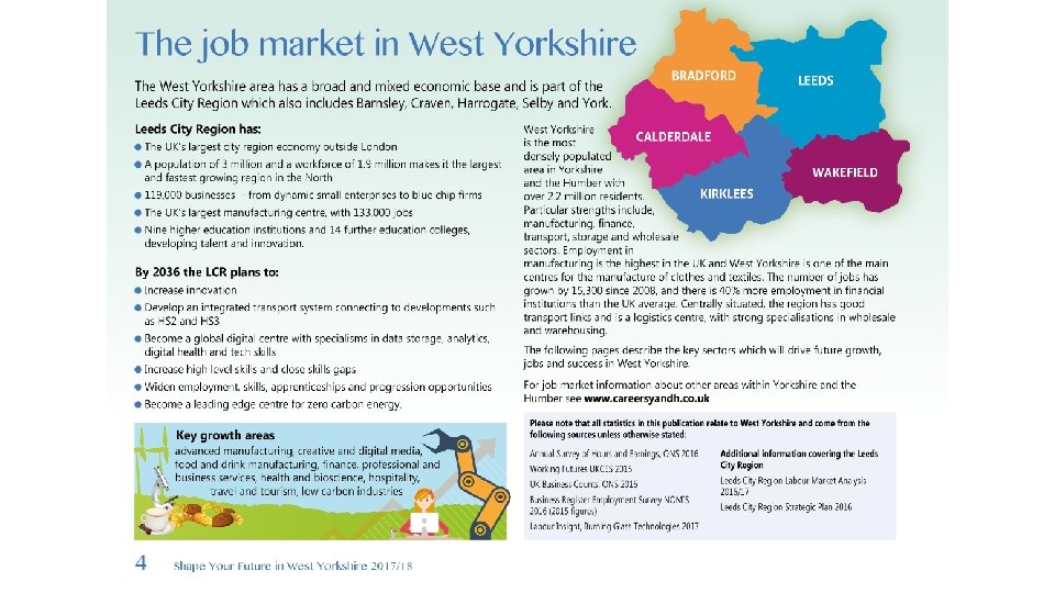 Average (median) weekly pay for full-time jobs in Bradford is £ 476 (source: Annual Survey of Hours and Earnings, 2017) Sectors with the greatest number of employees in Bradford: 1. Wholesale and retail 2. Health and social care 3. Manufacturing 4. Education (source: BRES, 2016) Average distance travelled to work in Bradford – 7. 9 miles (national average 9. 3 miles) (source: 2011 Census) % of people who live in Bradford but work outside the district – 30% (source: 2011 Census) % of vacancies in Bradford that are hard to fill due to shortage of people with right skills: 25% (source: Employer Skills Survey, 2015) Facts about Bradford