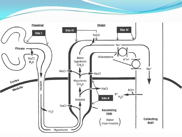 Renal handling of Chloride �Predominantly excreted by the kidneys � 99% reabsorbed � 60% passively in proximal tubules following active sodium transport � 15 -25% in loop of Henle � 5% in distal tubule - aldosterone