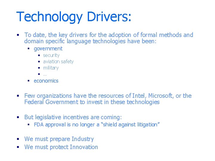 Technology Drivers: § To date, the key drivers for the adoption of formal methods and domain specific language technologies have been: § government § § security aviation safety military … § economics § Few organizations have the resources of Intel, Microsoft, or the Federal Government to invest in these technologies § But legislative incentives are coming: § FDA approval is no longer a “shield against litigation” § We must prepare Industry § We must protect Innovation