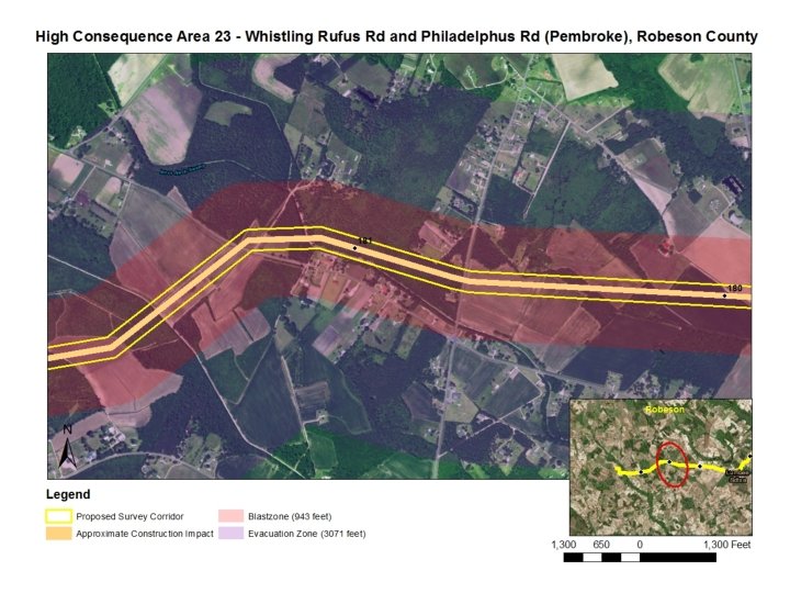Blast Zone, Incineration Zone or the Potential Impact Radius is the distance at which there is a reasonable risk of incineration, injury, or even death. Blast zone = 0. 69 x square root of maximum allowable operating pressure of pipeline in psi x pipeline diameter in inches For Atlantic Coast Pipeline with a maximum allowable operating pressure of 1440 psi and diameter of 36 in. , this zone extends to 943 ft. The Evacuation Zone, defined as the area persons would need to move beyond to avoid risk of a burn injury in the event of a pipeline explosion, is 3071 feet from center of a 36 inch diameter pipeline, at 1400 psi. High Consequence Areas areas within which the extent of damage to property or the chances of serious injury or death are significant, in case of a rupture or significant leak, generally 20 or more occupied buildings within Blast Zone, or with particularly vulnerable populations