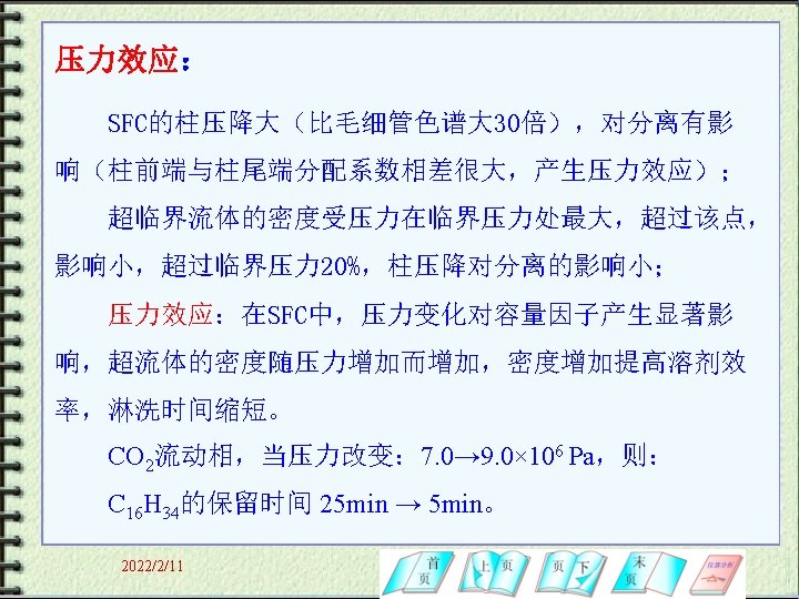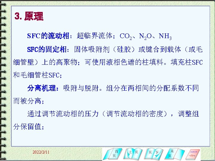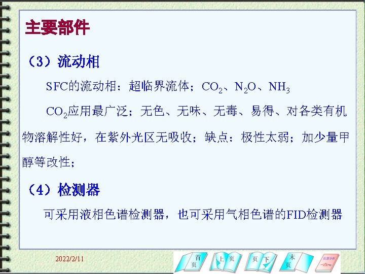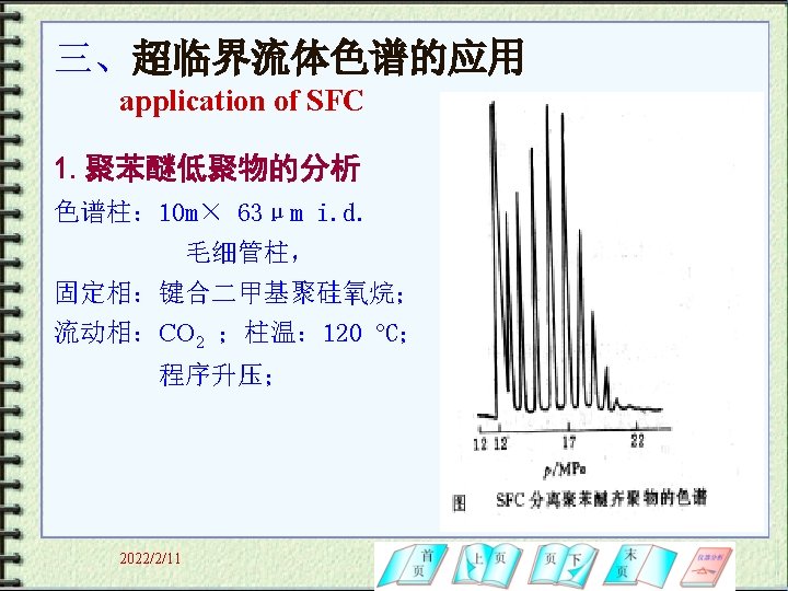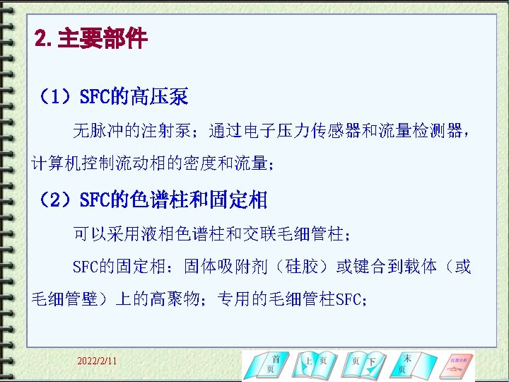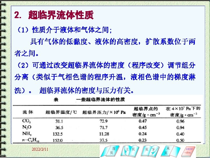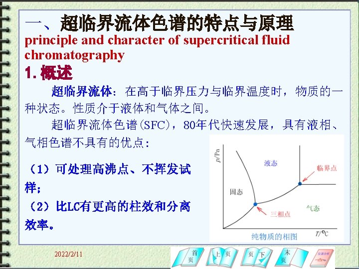 第十章 液相色谱分析法 high performance liquid chromatograph 第六节 超临界色谱 supercritical fluid chromatograph, SFC 2022/2/11 一、超临界流体色谱的特点 与原理 feature and principle of SFC 二、超临界流体色谱仪的结 构流程 structure and general process of SFC 三、超临界流体色谱的应用 application of SFC