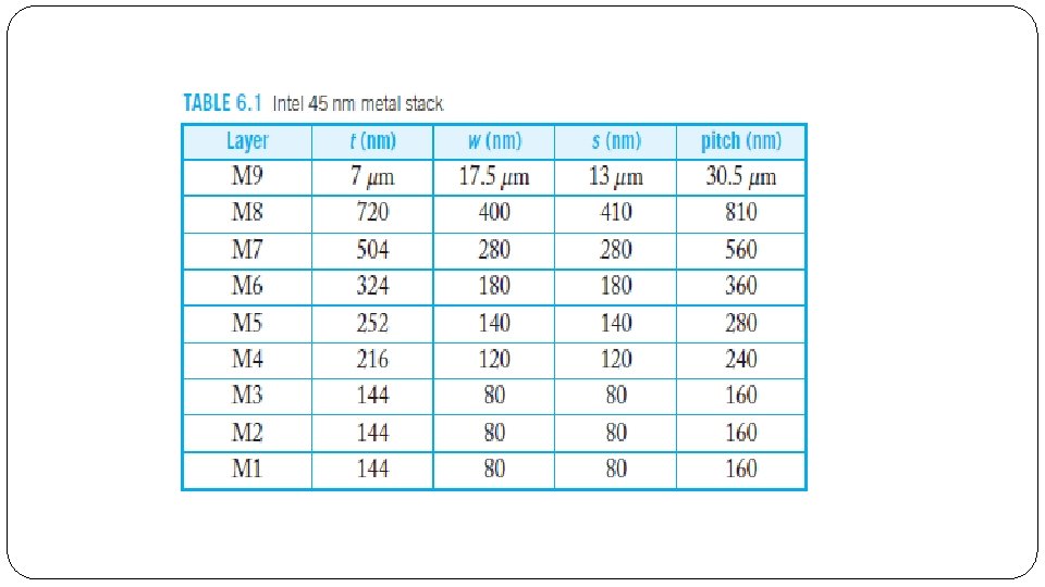 Interconnect Scaling �Ideal scaling: Global wirelength increase by factor S due to increase in overall die area by factor Sc ; local wire length reduced by factor s due to gate pitch reduction by factor s 2 �Quasi ideal scaling: vertical dimensions scaled by factor 1/√ s compared to horizontal �Scaling based on constant resistance Local and global wire resistance remain constant �Scaling based on constant thickness Local and global wire thickness remain constant