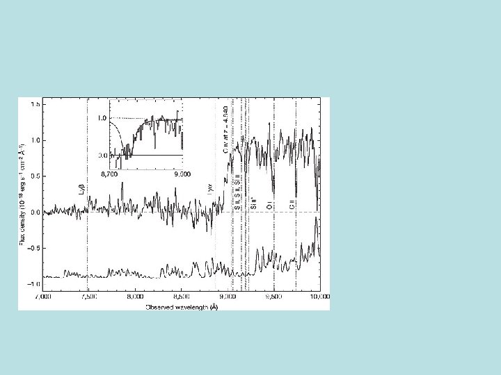 (observed; Lyman- )=9190Å (rest; Lyman- )=1216Å 1% of night sky emission Redshift=6. 558 Filter profile Lyman- emission line Hu, Cowie, Mc. Mahon etal, 2002