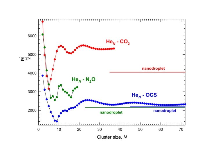 He. N – OCS Clusters • Unexpected broad oscillations in B-value mark shell structure • Sharp (0. 001 cm-1) infrared lines observed up to N = 73 (at least) • Sharp (15 k. Hz) microwave lines observed up to N = 39 (at least) • Large clusters (N = 100+) are (easily) made in an ‘ordinary’ seeded pulsed supersonic jet • Cluster size distribution can be rather narrow ( N ~ 10) • At N = 70, observable properties are fairly close to nanodroplet values (N = 10, 000), so we have probed much of the transition from micro to macro with atomic resolution (N by N)