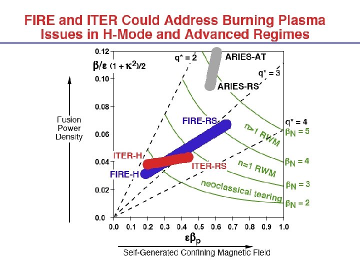 Both ITER and FIRE are Proposing to Explore and Exploit Advanced Tokamak Operating Modes Existing Toks ITER-AT FIRE-AT ARIESRS/AT kx ≤ 2. 2 1. 85 2. 0 dx ≤ 0. 8 0. 49 0. 7 Configuration SN & DN SN DN DN N ≤ 4. 5 ~3 ~4 ~5 % Non-inductive 100 100 % bootstrap ≤ 85 50 80 90 Equilibration % ~50 ~100 steady Plasma rotation high low Very low RWM Coils (rel. to First Wall) Inside VV Outside TF Integrated With FW Inside TF Outside VV On axis CD PNB, NINB ICFW Off axis CD LH, PNB, (EC) LH LH LH Physics Items