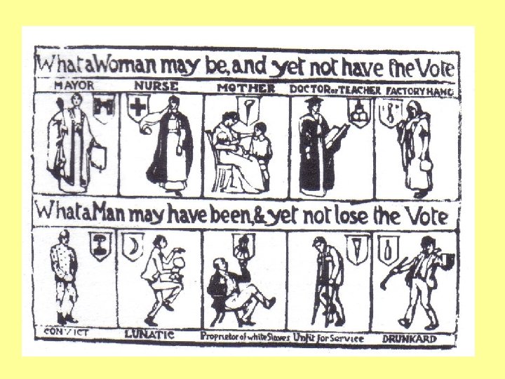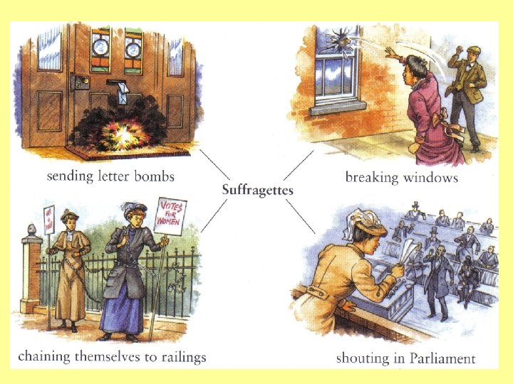 Background (need for intro) • During the 19 th century many laws were passed which made Britain more democratic by enfranchising men, but women were never given the right to vote in elections • Most men, including those in government, believed women were uneducated, unworldly, fickle, immature and understood little about the world of politics, economics and business • A woman’s place was believed to be at home in the role of wife and mother; men and women were seen as operating in separate ‘spheres’ or worlds; men in politics and women in motherhood • Women wanted the vote as it gave them a voice nationally and they needed it to force greater change for women in Britain