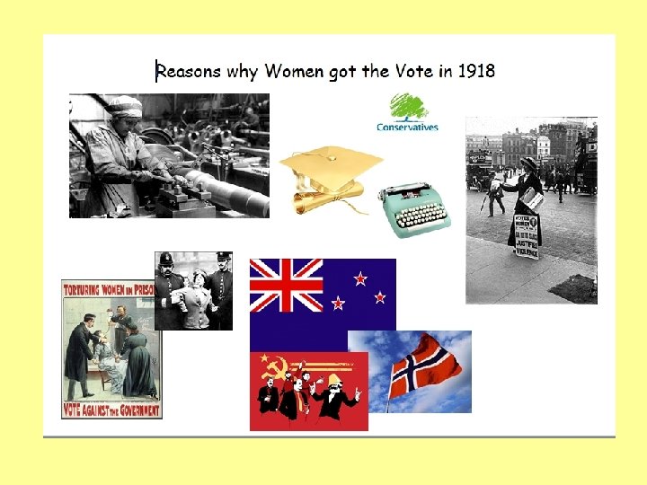 Conclusion – 4 step plan • In conclusion, there were many reasons for women receiving the vote in 1918. • On the one hand… (you should take one key factor here and explain why it was important) • On the other hand… (now you should do the same with another key factor to balance your argument) • Overall, the most important factor was… (keep your strongest until last, backing up why it is so important and it should be clear why it outweighs the other factors)