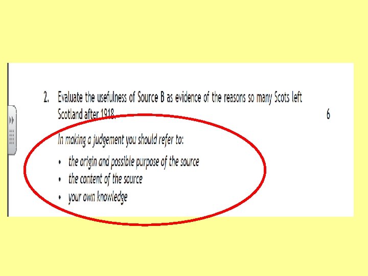 • Your task is to judge the source – identify what it tells us and what it doesn’t and make a JUDGEMENT about the extent of the source’s information • If you simply write out what the source tells us and what it doesn’t you will get 2 marks max (out of 9) • What you take from the source must be interpreted (explained) as you will receive 0 marks for copying at Higher • only use own knowledge = 2 marks • Your own knowledge must be highly detailed • Own knowledge can come from anywhere in the issue
