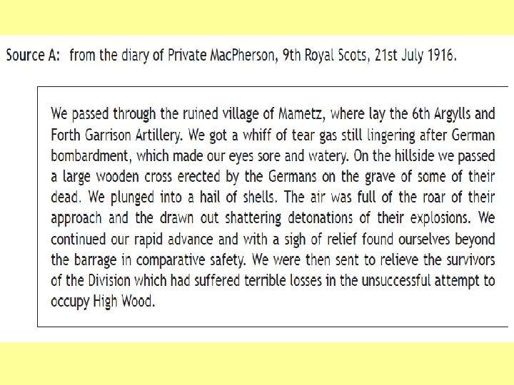 Model Answer – Source points Source A gives a fairly good explanation of the experience of Scots on the Western Front. The source says the Scots were magnificent trench fighters. This means that Scots were extremely good at trench warfare and were viewed as excellent fighters. (1 mark source) The source says the Scots experienced great success fighting the Germans from November 1916. This means the Scots should be recognised for their military achievements after November 1916 as they were fighting an opposition of very high quality. (1 mark - source) The source says the Germans had come to greatly fear the Scots specifically the Highland Division. This means the Scots scared the Germans as they had such an unblemished record of success and bravery & a good reputation after the Battle of the Somme. (1 mark - source)