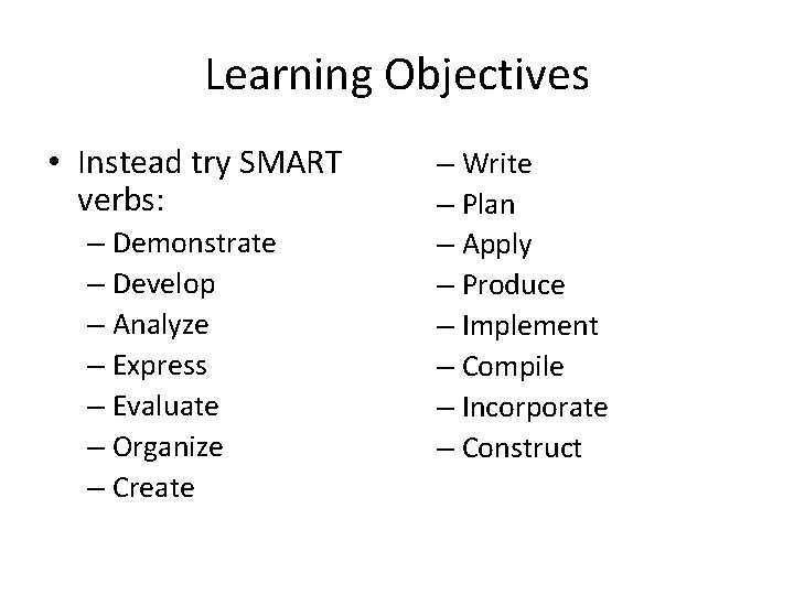 Learning Objectives • Instead try SMART verbs: – Demonstrate – Develop – Analyze – Express – Evaluate – Organize – Create – Write – Plan – Apply – Produce – Implement – Compile – Incorporate – Construct