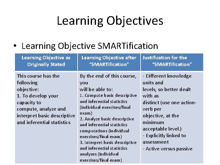 Learning Objectives • Learning Objective SMARTification Learning Objective after Justification for the Learning Objective as Originally Stated “SMARTification” This course has the following objective: 1. To develop your capacity to compute, analyze and interpret basic descriptive and inferential statistics By the end of this course, - Different knowledge you units and will be able to: levels, so better dealt 1. Compute basic descriptive with as and inferential statistics distinct (use one action(individual exercises/final verb per exam) objective, at the 2. Analyze basic descriptive minimum and inferential statistics acceptable level. ) computations (individual - Explicitly linked to exercises/final exam) 3. Interpret basic descriptive assessment and inferential statistics - Active versus passive analyses (individual exercises/final exam)