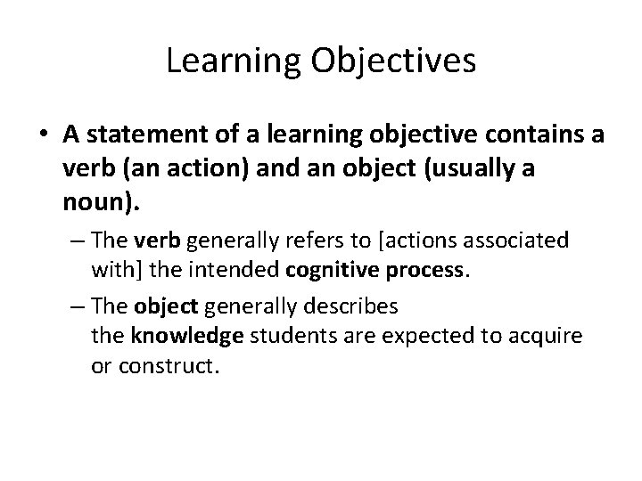 Learning Objectives • A statement of a learning objective contains a verb (an action) and an object (usually a noun). – The verb generally refers to [actions associated with] the intended cognitive process. – The object generally describes the knowledge students are expected to acquire or construct.