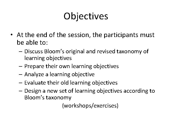 Objectives • At the end of the session, the participants must be able to: – Discuss Bloom’s original and revised taxonomy of learning objectives – Prepare their own learning objectives – Analyze a learning objective – Evaluate their old learning objectives – Design a new set of learning objectives according to Bloom’s taxonomy (workshops/exercises)