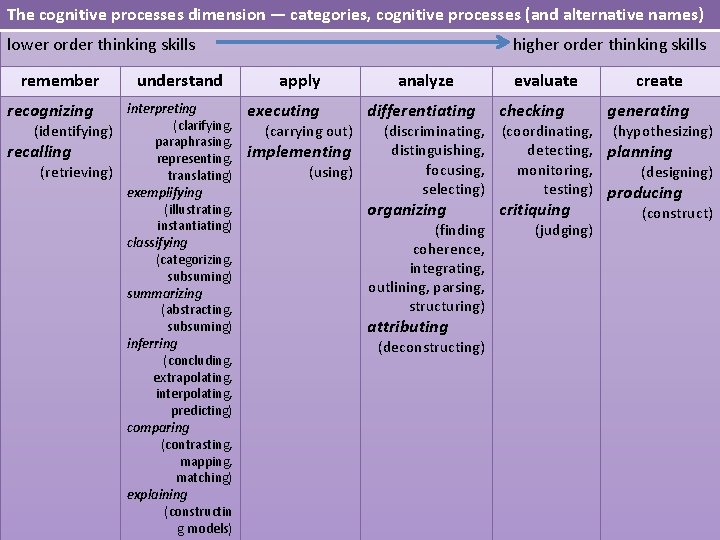 The cognitive processes dimension — categories, cognitive processes (and alternative names) lower order thinking skills higher order thinking skills remember recognizing (identifying) recalling (retrieving) understand interpreting (clarifying, paraphrasing, representing, translating) exemplifying (illustrating, instantiating) classifying (categorizing, subsuming) summarizing (abstracting, subsuming) inferring (concluding, extrapolating, interpolating, predicting) comparing (contrasting, mapping, matching) explaining (constructin g models) apply executing (carrying out) analyze differentiating evaluate checking create generating (discriminating, (coordinating, (hypothesizing) distinguishing, detecting, planning implementing focusing, monitoring, (using) (designing) selecting) testing) producing organizing critiquing (construct) (finding (judging) coherence, integrating, outlining, parsing, structuring) attributing (deconstructing)