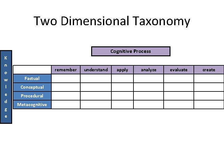 Two Dimensional Taxonomy Cognitive Process K n o w l e d g e remember Factual Conceptual Procedural Metacognitive understand apply analyze evaluate create