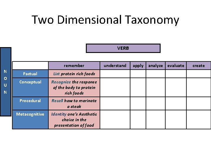 Two Dimensional Taxonomy VERB remember N O U N Factual List protein rich foods Conceptual Recognize the response of the body to protein rich foods Procedural Recall how to marinate a steak Metacognitive Aesthetic choice in the presentation of food understand apply analyze evaluate create