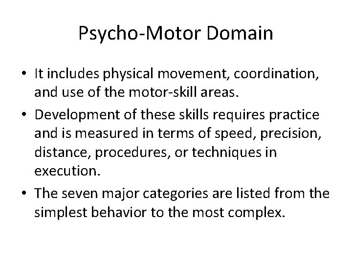 Psycho-Motor Domain • It includes physical movement, coordination, and use of the motor-skill areas. • Development of these skills requires practice and is measured in terms of speed, precision, distance, procedures, or techniques in execution. • The seven major categories are listed from the simplest behavior to the most complex.