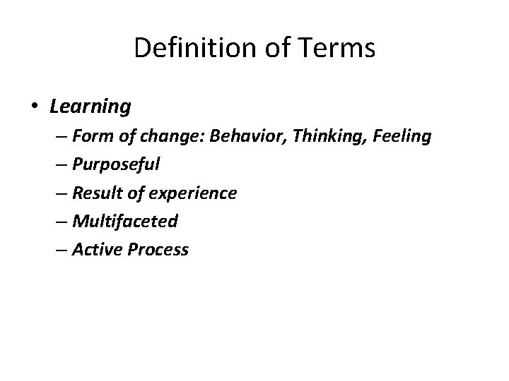 Definition of Terms • Learning – Form of change: Behavior, Thinking, Feeling – Purposeful – Result of experience – Multifaceted – Active Process