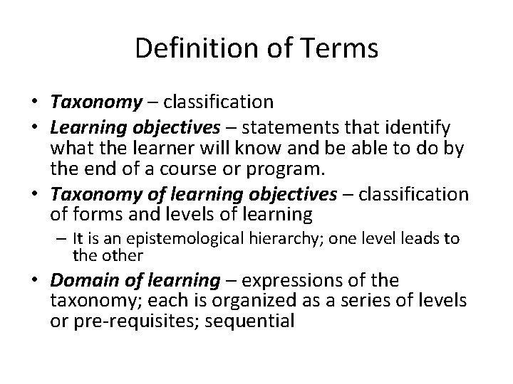 Definition of Terms • Taxonomy – classification • Learning objectives – statements that identify what the learner will know and be able to do by the end of a course or program. • Taxonomy of learning objectives – classification of forms and levels of learning – It is an epistemological hierarchy; one level leads to the other • Domain of learning – expressions of the taxonomy; each is organized as a series of levels or pre-requisites; sequential