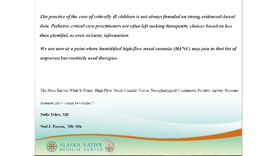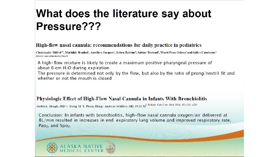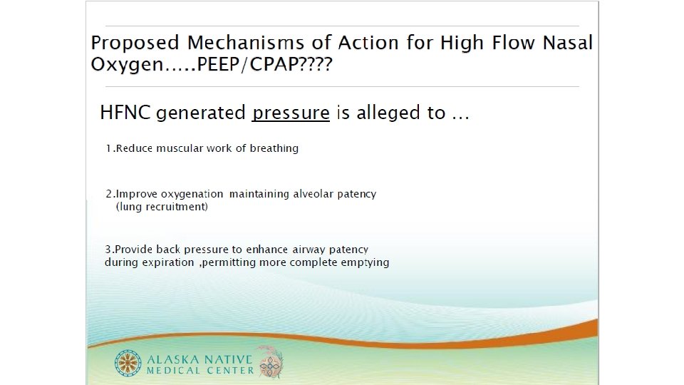 Disclaimer & Thanks • Portions of this talk were shamelessly stolen from Glenn Stryjewski, PICU physician extraordinaire, with his permission. Slides with the ANMC logo on the bottom were “borrowed” from him. • Assistance also came from Susan Romero, PICU NP extraordinaire. • Thank you to Clifton Dalton for sending me the hot-off-the-presses Life. Med recommendations. • In some places, I have over-simplified complex concepts in the interest of time. I am happy to forward Glenn’s entire talk to anyone who wants more detail. • You Tube has several helpful videos on setting up HFNC.