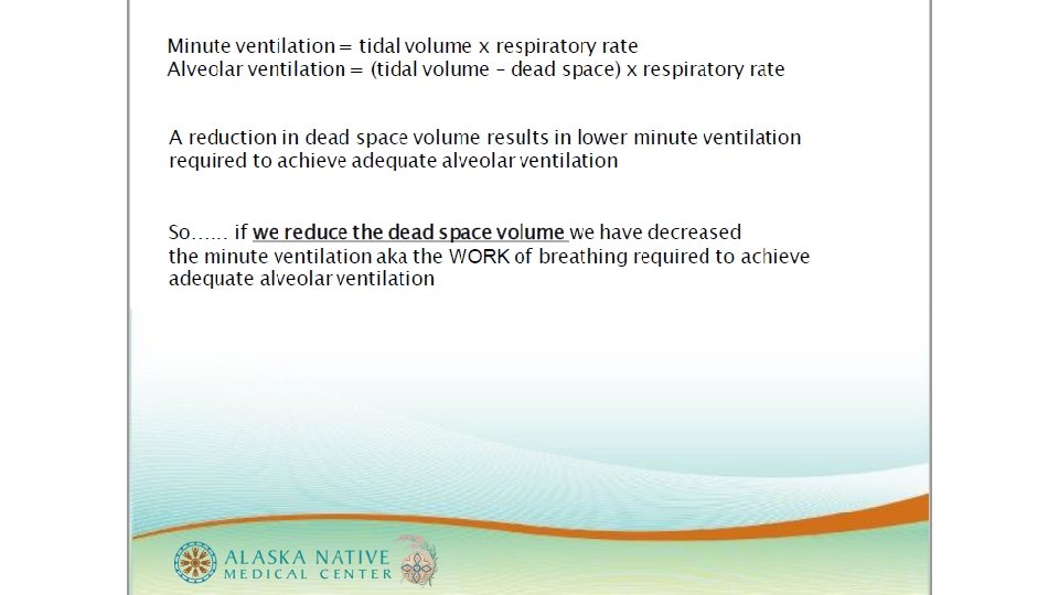 Flushing out the dead space • High flow oxygen “washes out” the expired gas in the dead space. • This reduces CO 2 re-breathing. • Per Glenn, “Flushing of upper airway dead space improves ventilatory efficiency and reduces the work of breathing. ”