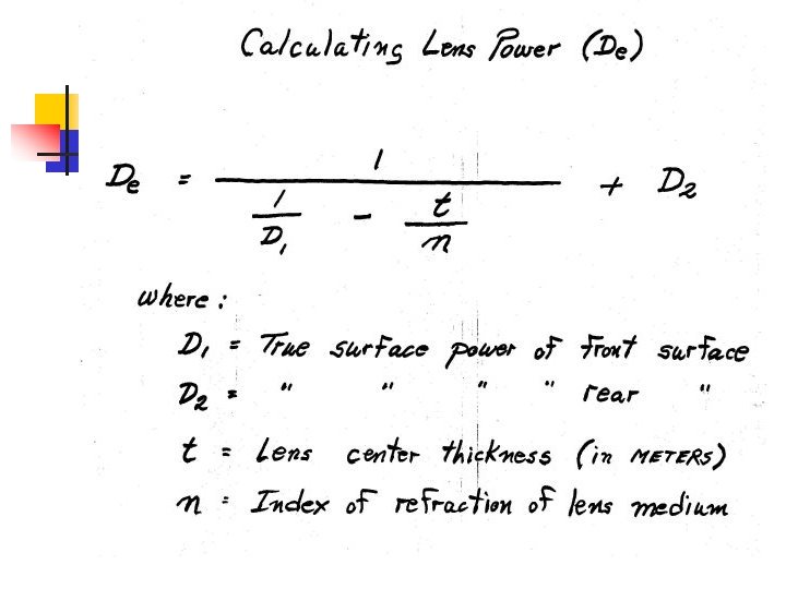 Highlights of Topics / Course Structure (no Quizzes !!!) n n n Personal Intro – Dick Whitney Index of Refraction, Abbe Values Surface Curvature, Lens Power (Back Vertex Power) The RX (prescription) : minus vs. plus cyl notations, axis angle, etc. Lensometer / Humphrey Focimeter Ophthalmic lens Styles Aspheric optics and off-axis performance Measuring Add Power Standards and their practical applications AO Lens Design Background Molding stress (Oracle) and its effect on final product