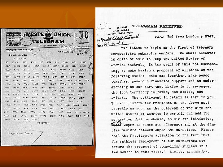ZIMMERMAN TELEGRAM n Telegram to the German Minister in Mexico saying if the United States went to war, Germany would form an alliance with Mexico to help them get back “lost territories” from the U. S. in the 1840’s.