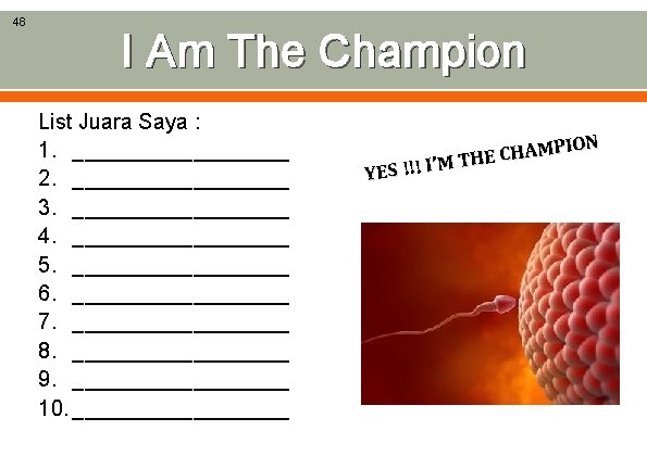 5 Tentang Kehebatan Anda Terdiri dari 100 miliar sel syaraf Genius = _______ % 1 sel syaraf terdapat 20. 000 cabang Pintar = _______ % Anda = _______% Kalau 100 miliar = _________ cabang Kita cenderung melakukan hal yang _____ dengan cara yang _____ alias tidak mau _______ atau mencoba hal yang ______.